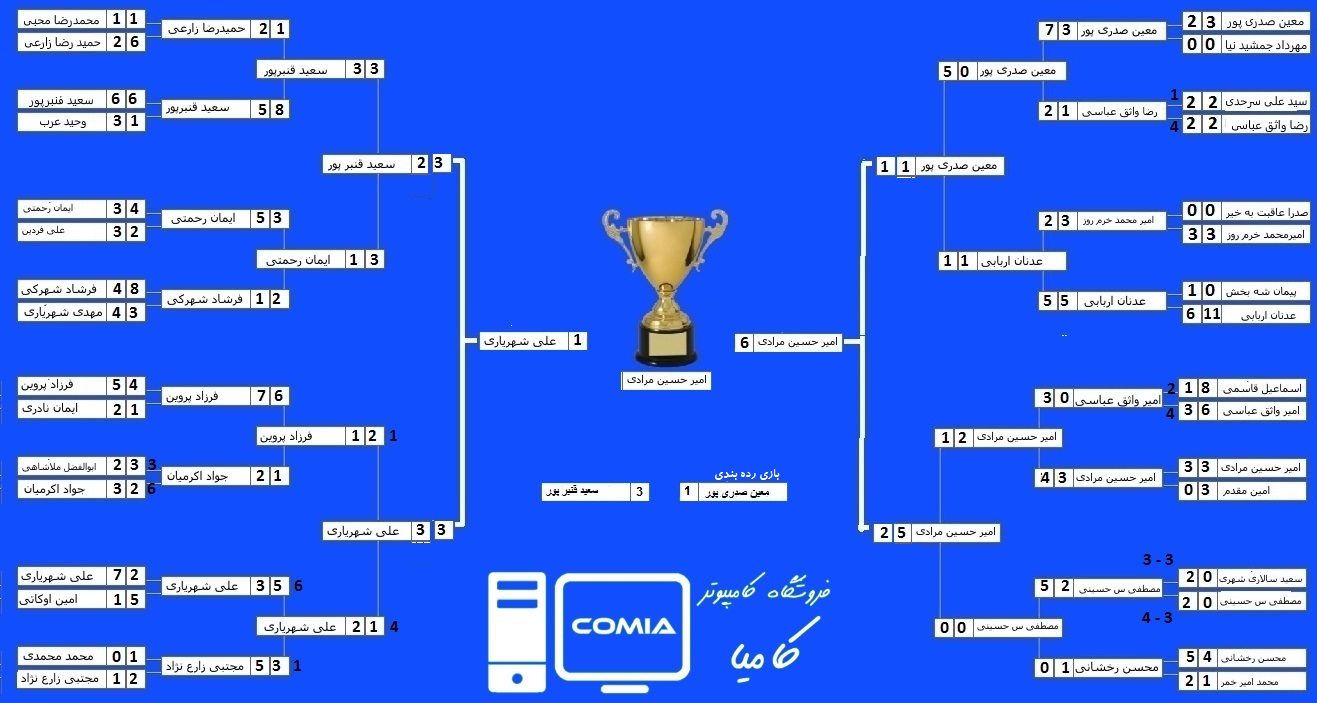 پس از انجام بازی های مرحله ی حذفی علی شهریاری و امیر حسین مرادی به فینال مسابقات راه پیدا کردند و در یک بازی پر هیجان امیرحسین مرادی توانست با نتیجه ۶ بر ۱ پیروز شده و عنوان قهرمانی مسابقات بدست آورد.
